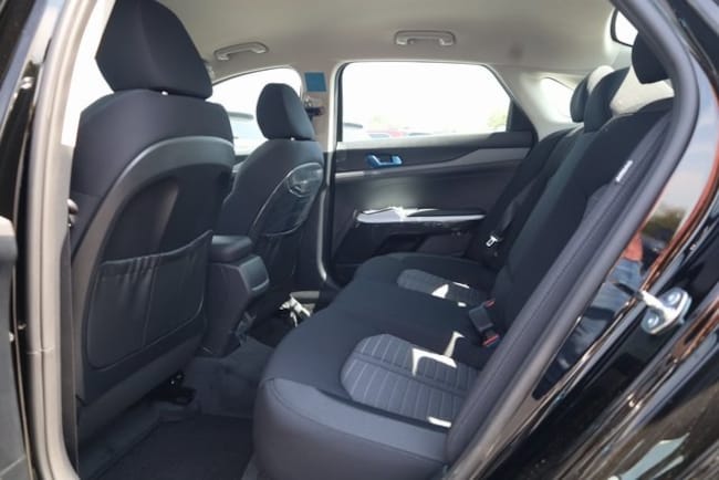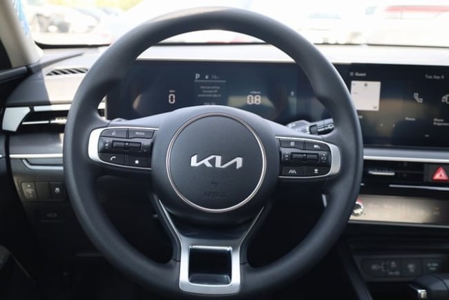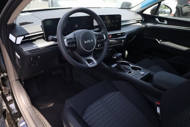 This K5 is well equipped with 4-Wheel Disc Brakes, 6 Speakers, ABS brakes, Air Conditioning, Alloy wheels, AM/FM radio: SiriusXM, Auto High-beam Headlights, Automatic temperature control, Brake assist, Bumpers: body-color, Carpeted Floor Mats, Cloth Seat Trim, Delay-off headlights, Driver door bin, Driver vanity mirror, Dual front impact airbags, Dual front side impact airbags, Electronic Stability Control, Emergency communication system: Kia Connect (includes 1 year free trial), Four wheel independent suspension, Front anti-roll bar, Front Bucket Seats, Front Center Armrest, Front dual zone A/C, Front reading lights, Fully automatic headlights, Heated door mirrors, Illuminated entry, Knee airbag, Low tire pressure warning, Occupant sensing airbag, Outside temperature display, Overhead airbag, Overhead console, Panic alarm, Passenger door bin, Passenger vanity mirror, Power door mirrors, Power steering, Power windows, Radio data system, Radio: AM/FM Audio System, Rear anti-roll bar, Rear seat center armrest, Rear side impact airbag, Rear window defroster, Remote keyless entry, Security system, Speed control, Speed-sensing steering, Split folding rear seat, Steering wheel mounted audio controls, Tachometer, Telescoping steering wheel, Tilt steering wheel, Traction control, Trip computer, Variably intermittent wipers, and Wheels: 16" x 6.5J Gloss Black Alloy.