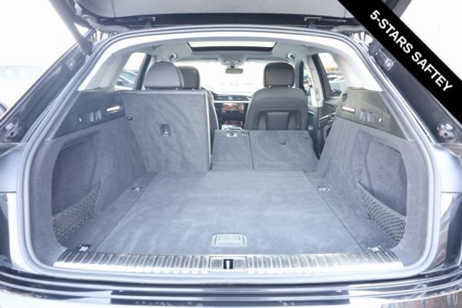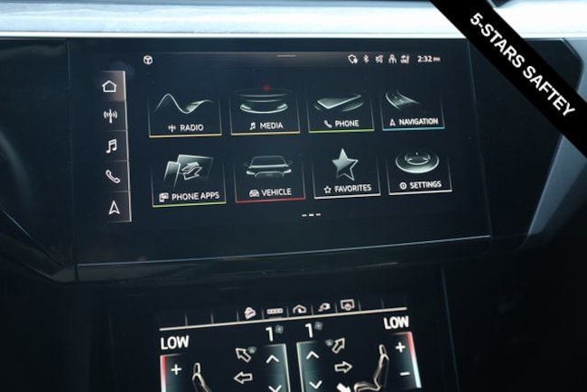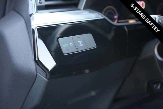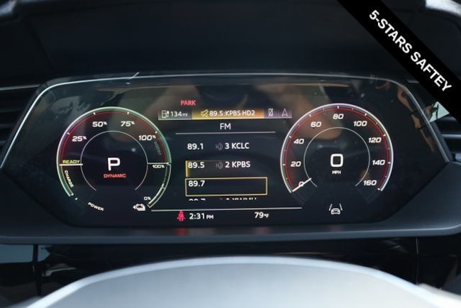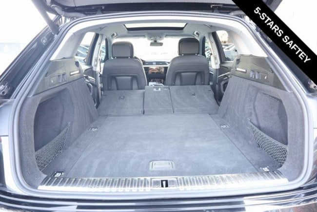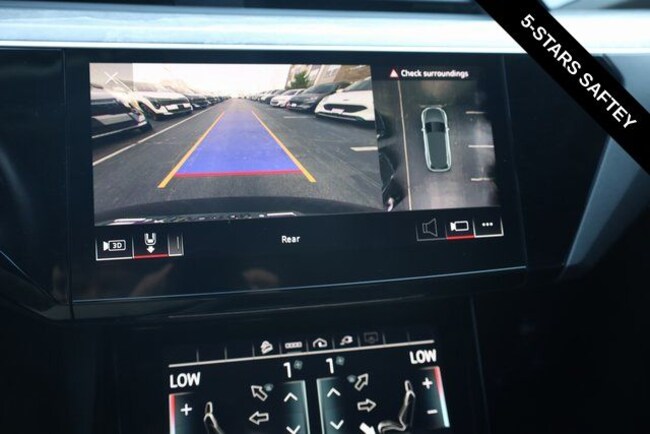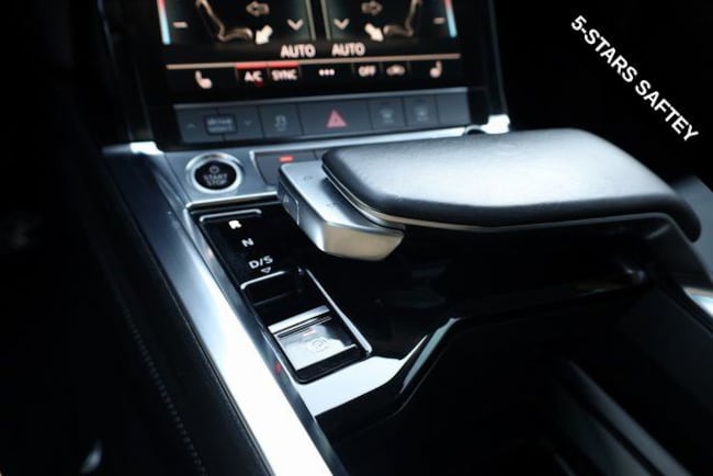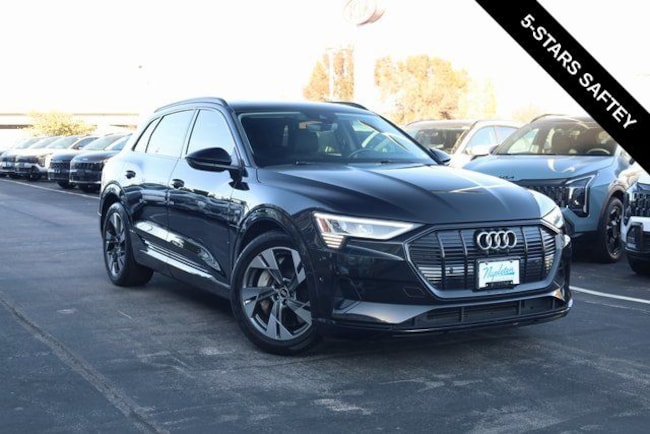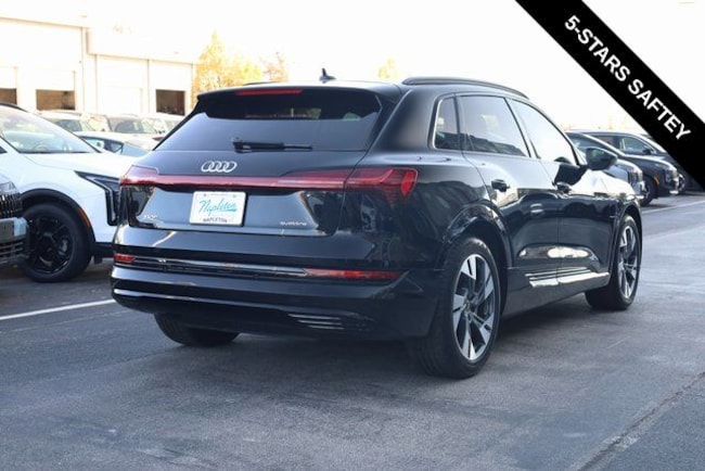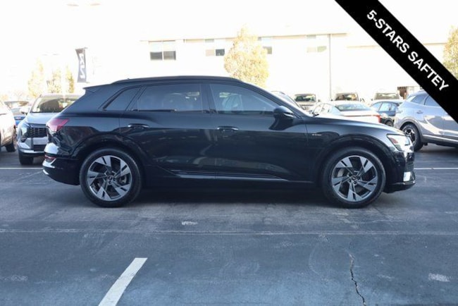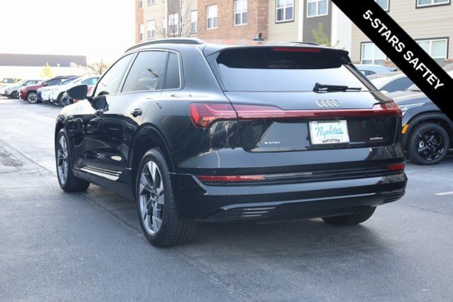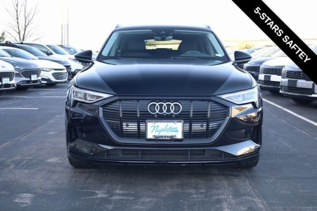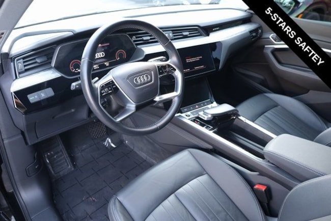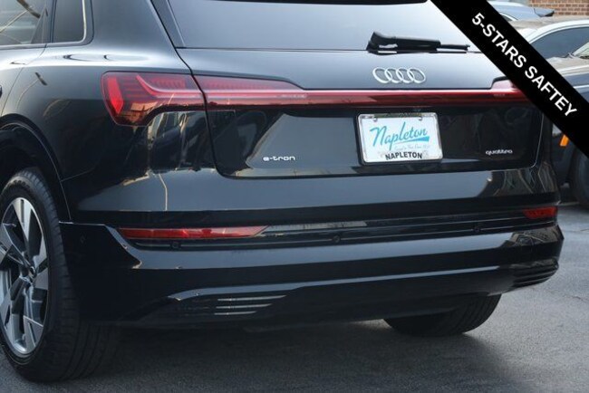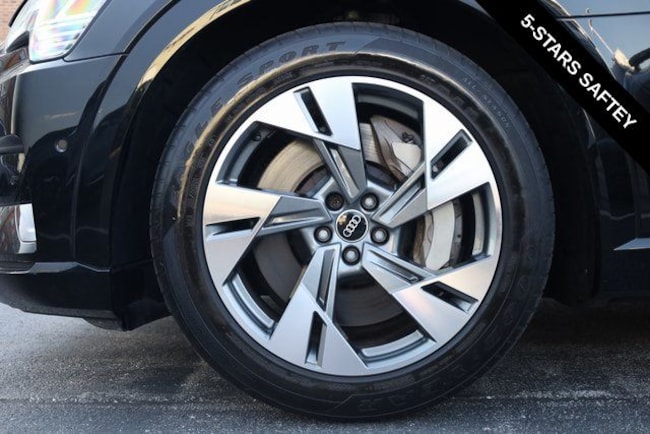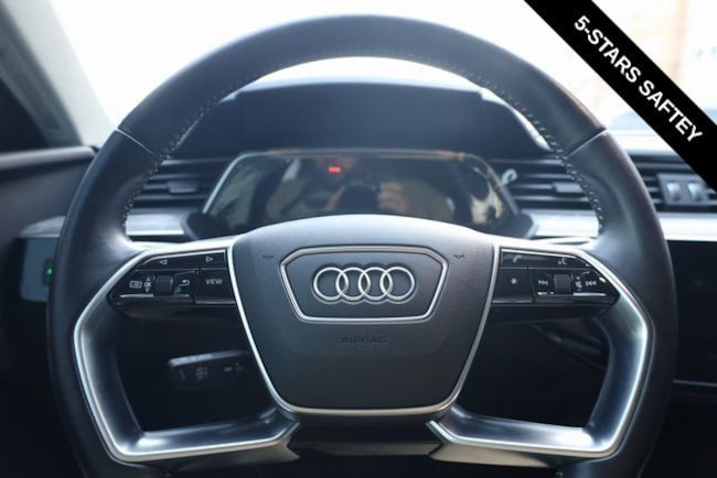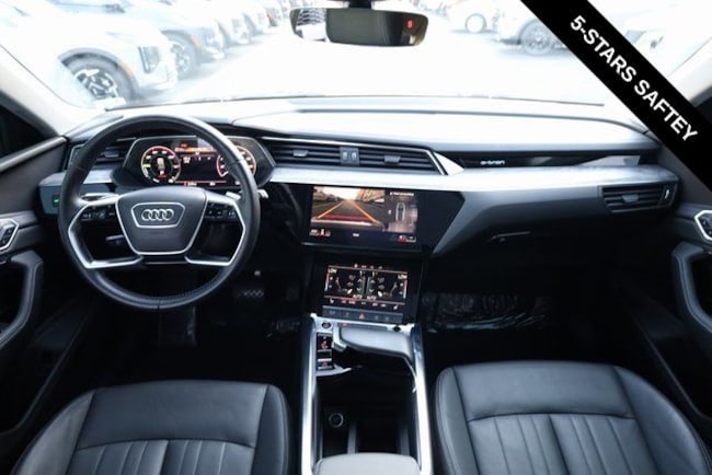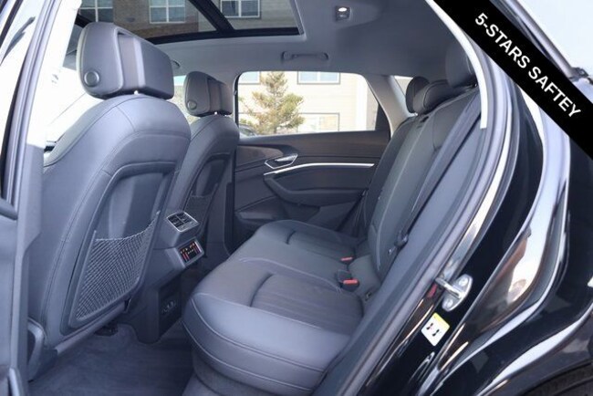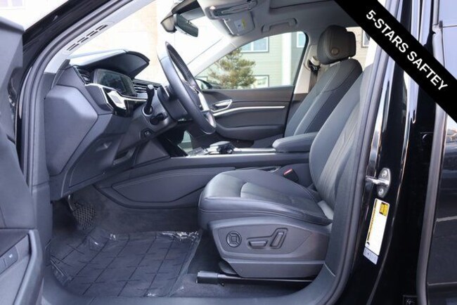 This e-tron is well equipped with Black Optic Exterior Package, Convenience Plus Package (Audi Active Lane Assist w/Emergency Assist, Audi Adaptive Cruise Assist, and Top View Camera System), Alloy wheels, Front dual zone A/C, Heated door mirrors, Heated front seats, Illuminated entry, Navigation system: Audi MMI Navigation plus with Touch Response, Power Liftgate, Rear dual zone A/C, Remote keyless entry, 10 Speakers, 4-Wheel Disc Brakes, 9.08 Axle Ratio, ABS brakes, Adaptive suspension, Air Conditioning, Audi smartphone interface (Apple CarPlay/Android Auto), Auto High-beam Headlights, Auto-dimming door mirrors, Auto-dimming Rear-View mirror, Auto-leveling suspension, Automatic temperature control, Brake assist, Bumpers: body-color, Compass, Delay-off headlights, Driver door bin, Driver vanity mirror, Dual front impact airbags, Dual front side impact airbags, Electronic Stability Control, Emergency communication system: Audi connect CARE, PRIME & PLUS, Exterior Parking Camera Rear, Four wheel independent suspension, Front anti-roll bar, Front Bucket Seats, Front Center Armrest, Front fog lights, Front reading lights, Fully automatic headlights, Garage door transmitter: HomeLink, Heated 8-Way Power Front Seats, Heated steering wheel, Leather Seating Surfaces, Low tire pressure warning, Memory seat, Occupant sensing airbag, Outside temperature display, Overhead airbag, Overhead console, Panic alarm, Passenger door bin, Passenger vanity mirror, Power door mirrors, Power driver seat, Power moonroof: Panoramic, Power passenger seat, Power steering, Power windows, Radio data system, Radio: HD FM/Sirius Satellite, Rear air conditioning, Rear anti-roll bar, Rear fog lights, Rear reading lights, Rear seat center armrest, Rear window defroster, Rear window wiper, Roof rack: rails only, Security system, Speed control, Speed-sensing steering, Split folding rear seat, Spoiler, Steering wheel memory, Steering wheel mounted audio controls, Telescoping steering wheel, Tilt steering wheel, Traction control, Trip computer, Turn signal indicator mirrors, Variably intermittent wipers, and Wheels: 20" 5-Double-Spoke Bi-Color Design.