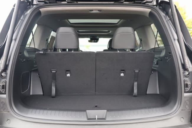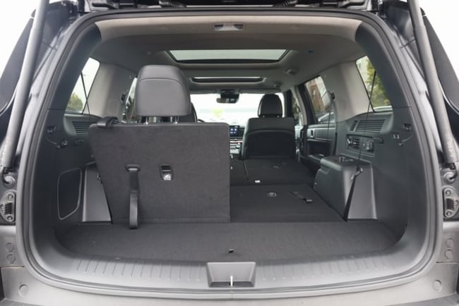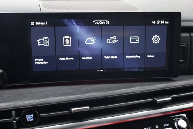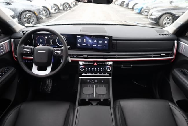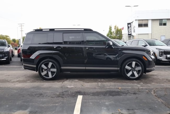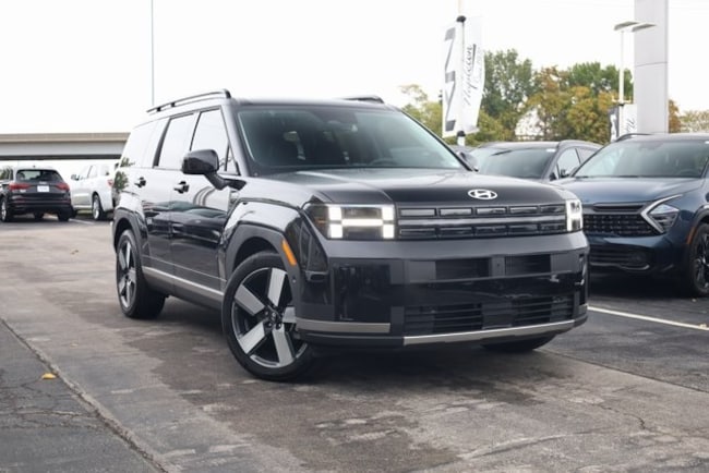 This Santa Fe is well equipped with Option Group 01, Black Leather, 12 Speakers, 3rd row seats: bench, 4-Wheel Disc Brakes, ABS brakes, Air Conditioning, Alloy wheels, AM/FM radio: SiriusXM, Apple CarPlay & Android Auto, Auto High-beam Headlights, Auto-dimming Rear-View mirror, Automatic temperature control, Axle Ratio: 3.316, Brake assist, Bumpers: body-color, Carpeted Floor Mats, Delay-off headlights, Driver door bin, Driver vanity mirror, Dual front impact airbags, Dual front side impact airbags, Electronic Stability Control, Emergency communication system, Exterior Parking Camera Rear, First Aid Kit, Four wheel independent suspension, Front anti-roll bar, Front Bucket Seats, Front Center Armrest, Front dual zone A/C, Front reading lights, Fully automatic headlights, Garage door transmitter: HomeLink, Heated & Ventilated Front Bucket Seats, Heated door mirrors, Heated front seats, Heated rear seats, Heated steering wheel, Illuminated entry, Knee airbag, Leather Seat Trim, Leather steering wheel, Low tire pressure warning, Memory seat, Mudguards, Navigation System, Occupant sensing airbag, Outside temperature display, Overhead airbag, Overhead console, Panic alarm, Passenger door bin, Passenger vanity mirror, Power door mirrors, Power driver seat, Power Liftgate, Power moonroof, Power passenger seat, Power steering, Power windows, Radio: AM/FM/HD Bose Premium Audio System, Rain sensing wipers, Rear anti-roll bar, Rear seat center armrest, Rear side impact airbag, Rear window defroster, Rear window wiper, Remote keyless entry, Security system, Speed control, Speed-sensing steering, Split folding rear seat, Spoiler, Steering wheel mounted audio controls, Tachometer, Telescoping steering wheel, Tilt steering wheel, Traction control, Trip computer, Turn signal indicator mirrors, Variably intermittent wipers, Ventilated front seats, Wheel Locks, and Wheels: 20" x 8.5J Alloy.